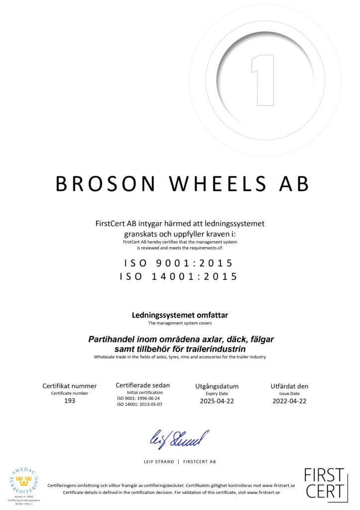 För att leva upp till våra kunders, leverantörers och medarbetares förväntningar arbetar vi därför på ett systematiskt sätt med både kvalitet och miljö för att uppnå ständiga förbättringar. Som ett bevis på vårt åtagande är Broson sedan 1996 certifierat enligt ISO 9001 och sedan 2013 är vi även certifierade enligt ISO 14001.”